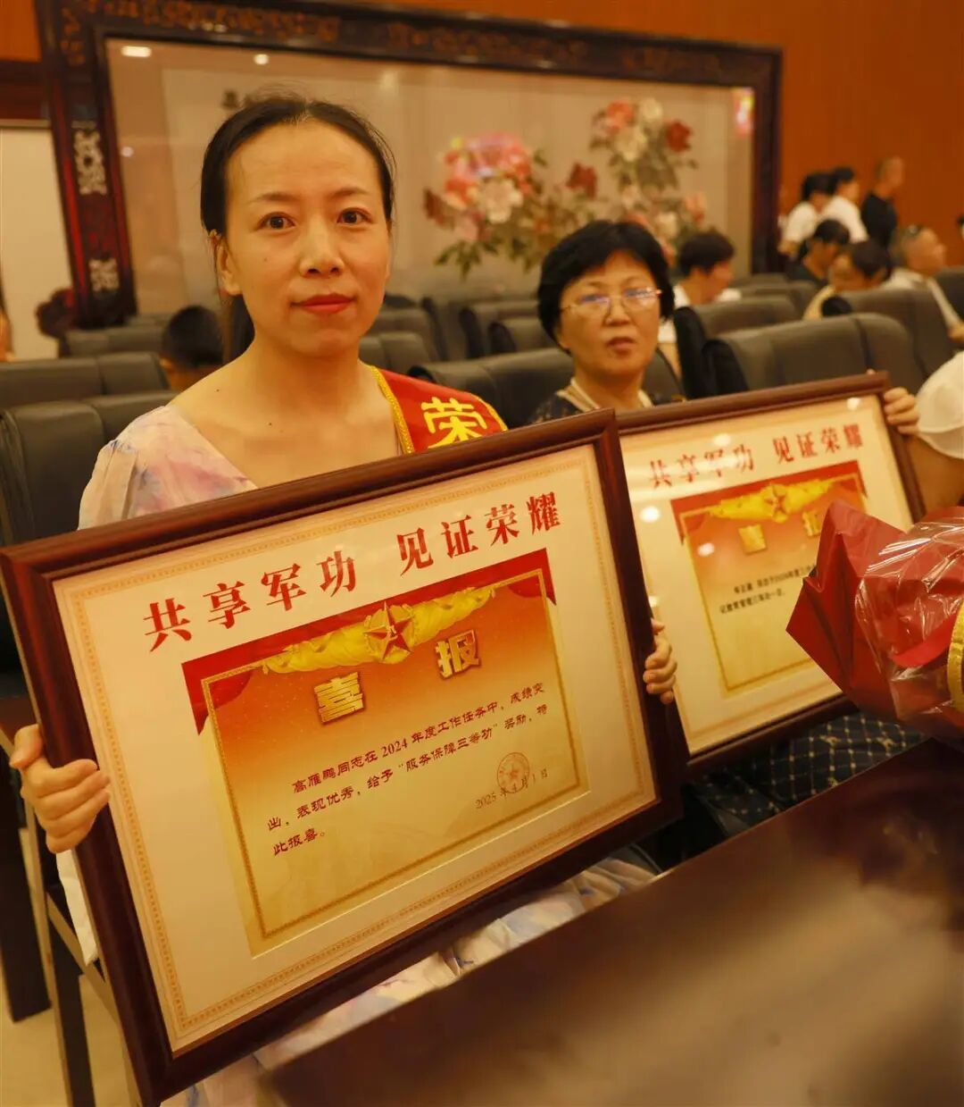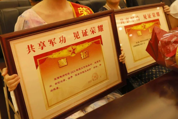 仪式现场,军地相关负责人为53位现役军人家属颁发了立功喜报。这53份喜报,其中有3人荣立二等功,50人荣立三等功。一本证书,一张喜报,一条绶带,凝聚着军人的辛勤汗水和无私奉献,见证着军人的成长进步,更是饱含着军属的大力支持和默默付出,53名现役军人家属脸上写满自豪,大家一起共享这份喜悦。