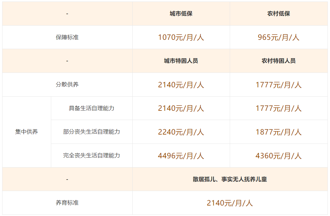 集中供养具备生活自理能力城市特困人员供养标准为2140元/人/月,其中,基本生活标准为1391元/人/月、照料护理标准为749元/人/月;集中供养部分丧失生活自理能力城市特困人员供养标准为2240元/人/月,其中,基本生活标准为1391元/人/月、照料护理标准为849元/人/月;集中供养完全丧失生活自理能力城市特困人员供养标准为4496元/人/月,其中,基本生活标准为1391元/人/月、照料护理标准为3105元/人/月。