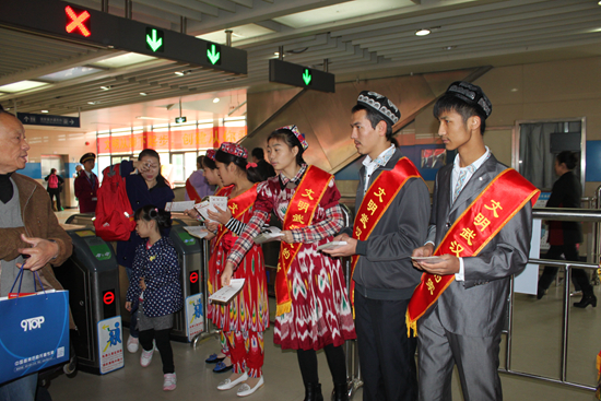 11月9日, 汉铁高中新疆班10名学生来到新荣轻轨站,通过发放宣传品等方式宣传文明创建。