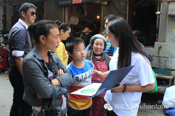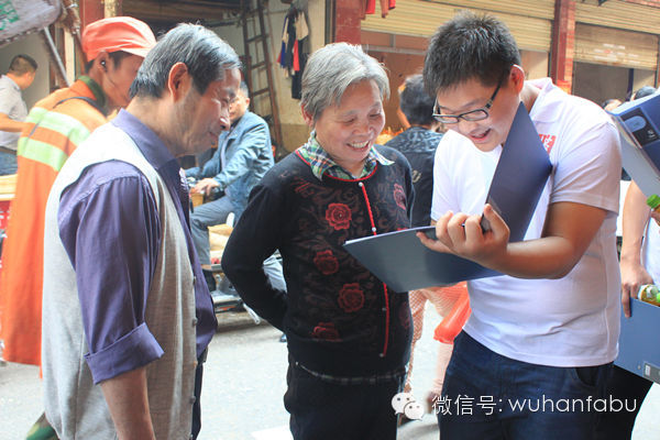 继上周武汉发布粉丝团走进江汉区横堤社区和常二社区的宣讲活动获得网友们的广泛响应后,昨天,通过“武汉发布”微信、微博平台报名的50名网友来到位于江岸区的花桥街三村社区,他们在号召社会群众为武汉文明创建做点事情同时也向社区里的居民们普及社会主义核心价值观的内容。花桥街三村社区虽属于老旧社区,但小区内公告栏和健身设施、供居民休憩的石板凳等各种服务设施一应俱全。居民们也都很有参与创城活动的热情,“姑娘,你们手里拿的是什么调查问卷呀?”碰到手拿社会主义核心价值观和文明城市评测指数调查表的网友,社区居民还主动上前询问了解情况。