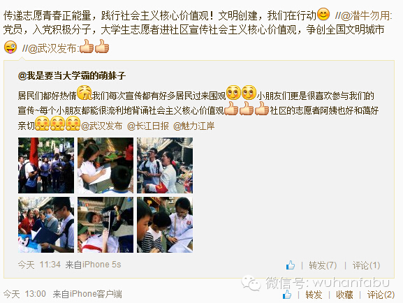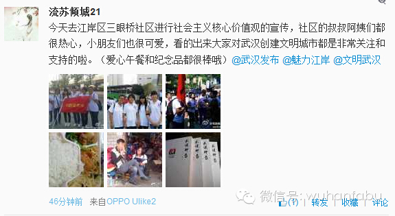 @流苏倾城21:今天去江岸区三眼桥社区进行社会主义核心价值观的宣传,社区的叔叔阿姨们都很热心,小朋友们也很可爱,看的出来大家对武汉创建文明城市都是非常关注和支持的啦。(爱心午餐和纪念品都很棒哦)