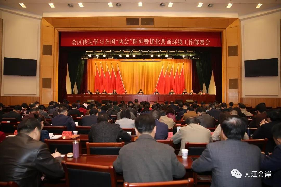要不折不扣贯彻落实全国两会精神,扎扎实实做好各项重点工作。要推动实现经济高质量发展,聚力产业转型升级,聚力“双招双引”,聚力创新创业创造,聚力发展民营经济。要坚定不移打好三大攻坚战,持之以恒打好污染防治攻坚战,响鼓重锤打好精准脱贫攻坚战,打好防范化解重大风险攻坚战。要全力以赴筹办好军运会,以更坚决的态度推进环境综合整治,扎实推进“十大专项行动”,重点治理“六边”“六乱”,推进城区环境面貌全域提升;全面提升城区功能品质环境,推进垃圾分类和“厕所革命”,提升城市精细化管理服务水平。要深入推进改革开放,以供给侧结构性改革为主线,系统推进“放管服”改革等各领域改革,整区推进“民呼我应”“企呼我应”改革,稳妥有序完成党政机构改革,扩大高水平开放,营造开放包容的良好氛围。要加快打造文化强区,在落实意识形态工作责任制上下功夫,加强互联网主阵地建设,抓牢学校思想政治理论教育;在提升城区文明程度上下功夫,完善社区、单位、学校、家庭“四位一体”文明实践机制,开展好“两创一做”“江岸文明地图”等活动;在推动文化繁荣上下功夫,实施“文化+”战略,推进文化惠民,巩固文化产业支柱地位。要着力保障改善民生,坚持以人民为中心的发展思想,坚持党委和政府带头过紧日子,让老百姓过好日子,加大民生投入,突出“一老一少”,全面优化教育、医疗、养老、就业、文化等公共服务,做好退役军人安置等工作,切实提升人民群众的获得感幸福感安全感。要深入推进全面从严治党,认真贯彻《中共中央关于加强党的政治建设的意见》,深化“红色引擎工程”,贯彻落实新修订的《党政领导干部选拔任用工作条例》,加强党风廉政建设,营造风清气正的政治生态。