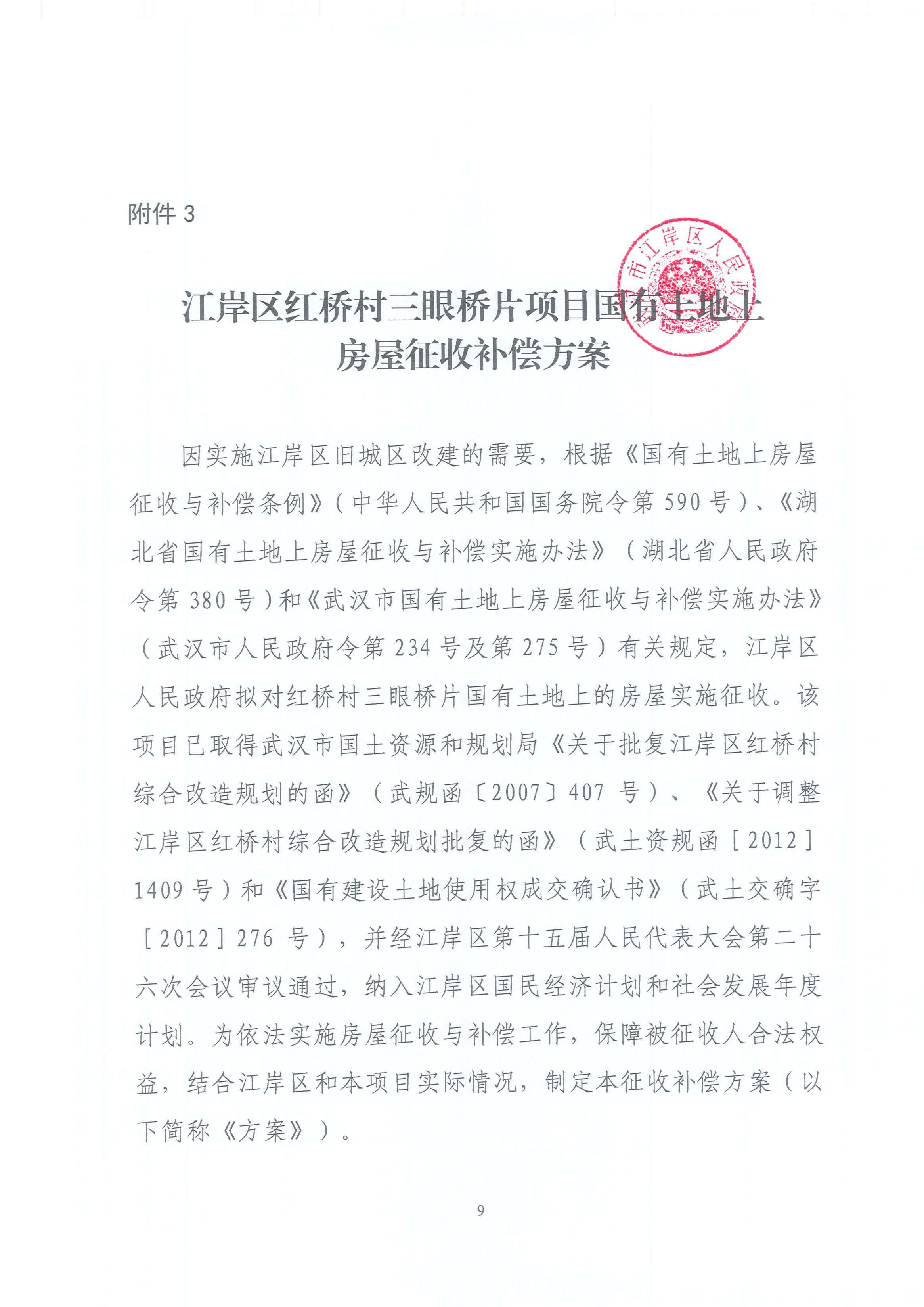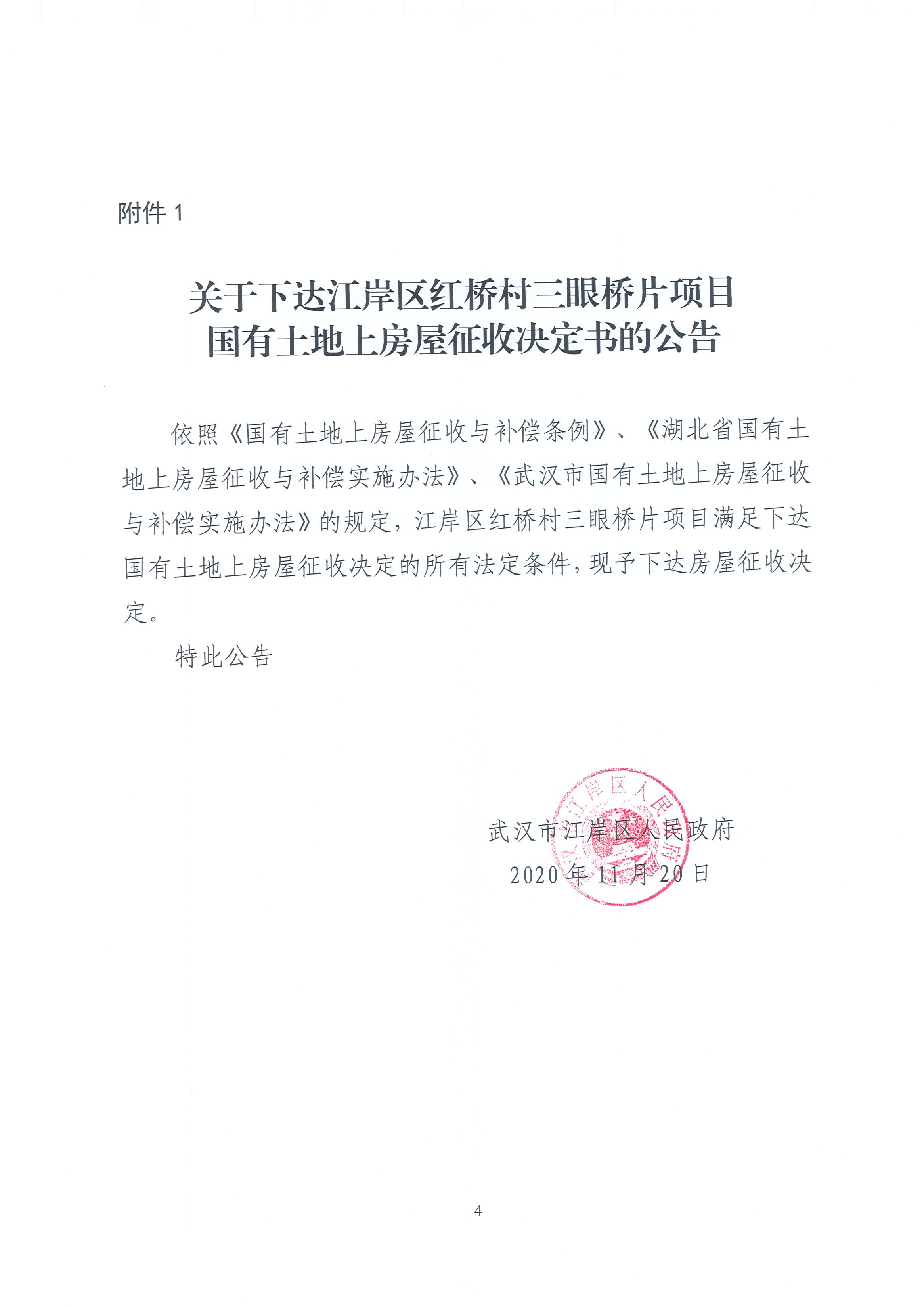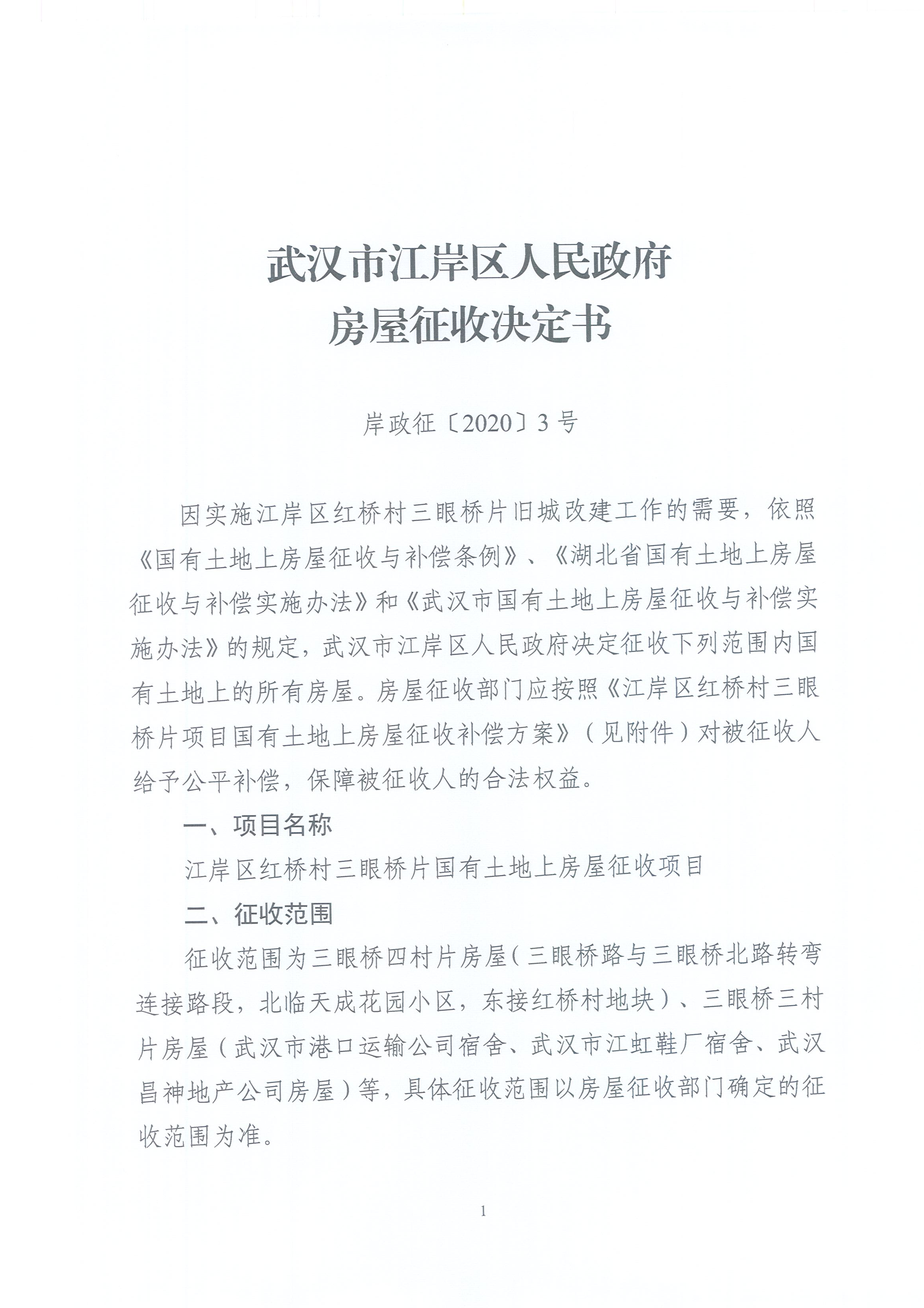 武汉市江岸区人民政府房屋征收决定书(江岸区红桥村三眼桥片国有土地上房屋征收项目)