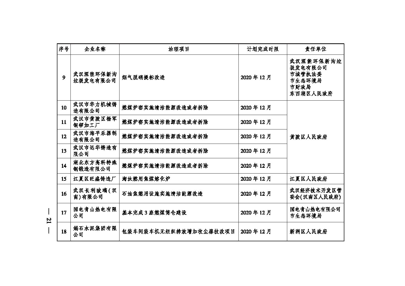 2.推进垃圾焚烧发电企业治理。协调督促垃圾焚烧发电企业有序实施烟气脱硝提标改造,力争改造后氮氧化物排放浓度不高于100毫克/立方米。(责任单位:市城管执法委、市生态环境局、市发展改革委、市财政局,汉阳、青山、江夏、东西湖、黄陂区人民政府)