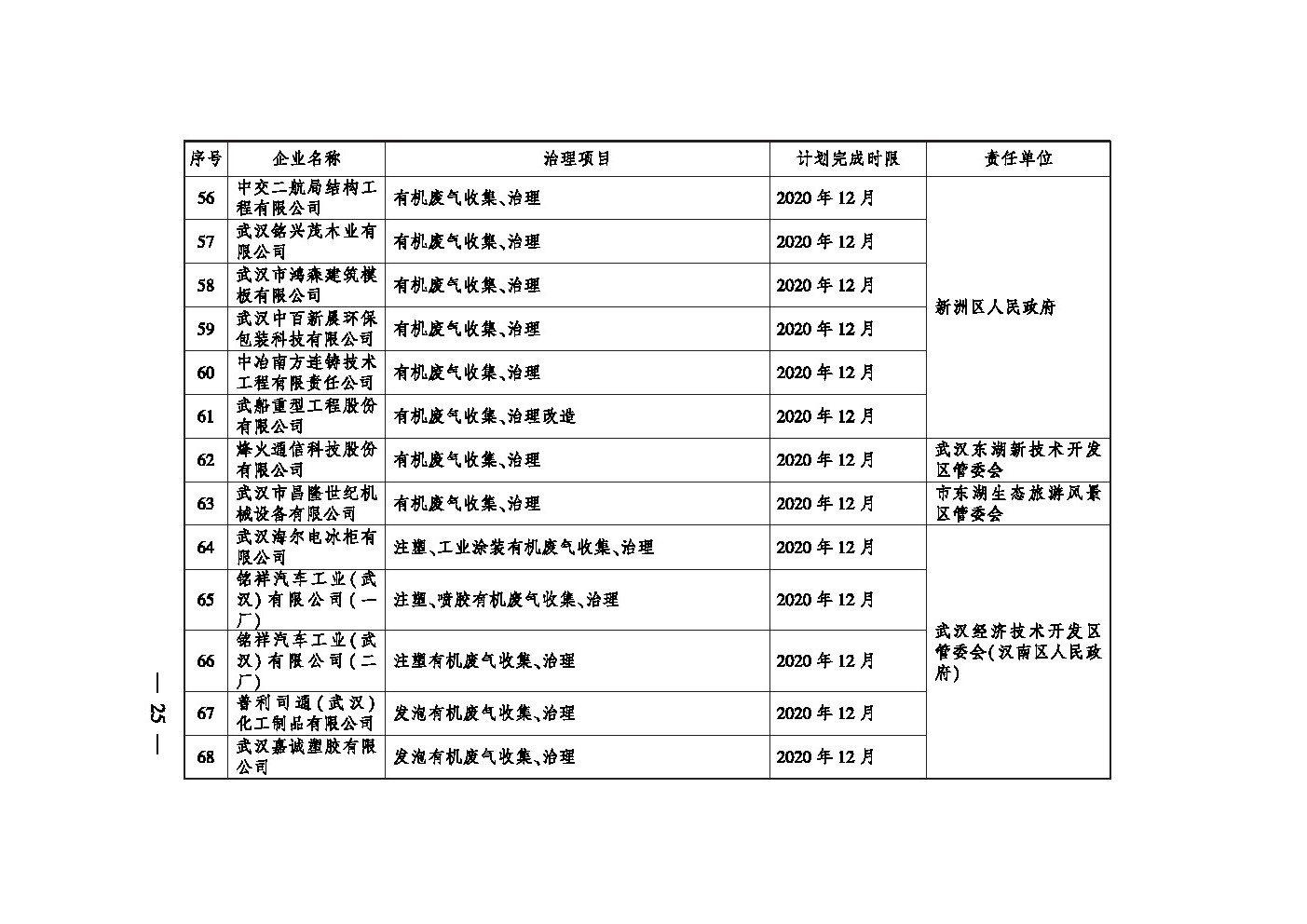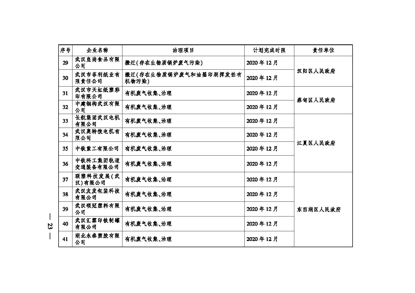 1.夯实重污染天气应急减排清单。按照《市人民政府关于印发武汉市重污染天气应急预案的通知》(武政规〔2020〕4号)要求,各区要编制重污染天气应急减排项目清单,组织纳入清单的企业按照“一厂一策”原则,编制应急响应操作方案,制作公示牌,安装在厂区入口等显要位置。(责任单位:市生态环境局、市经济和信息化局,各区人民政府)