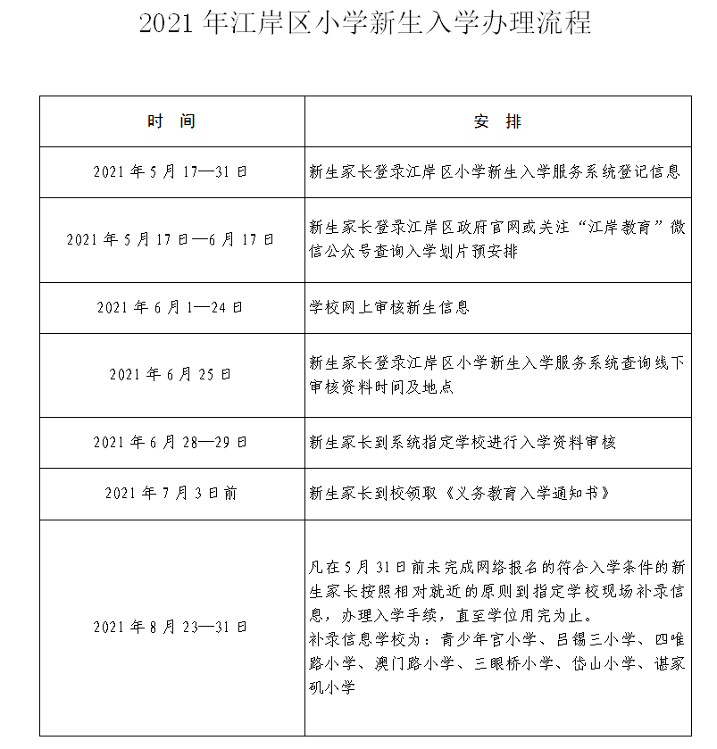 2021年江岸区小学新生入学办理流程