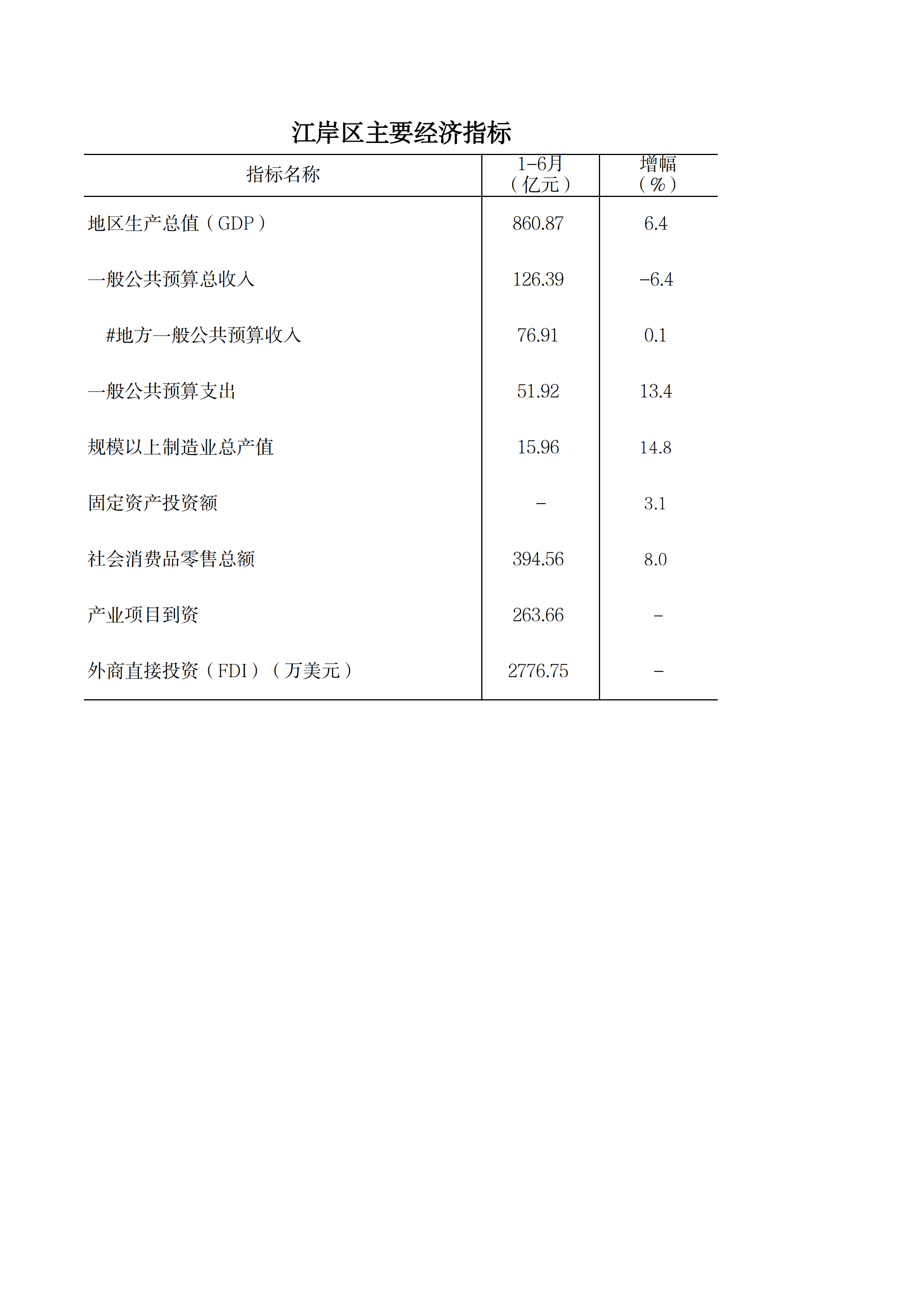 2025年1-6月江岸地区主要经济指标