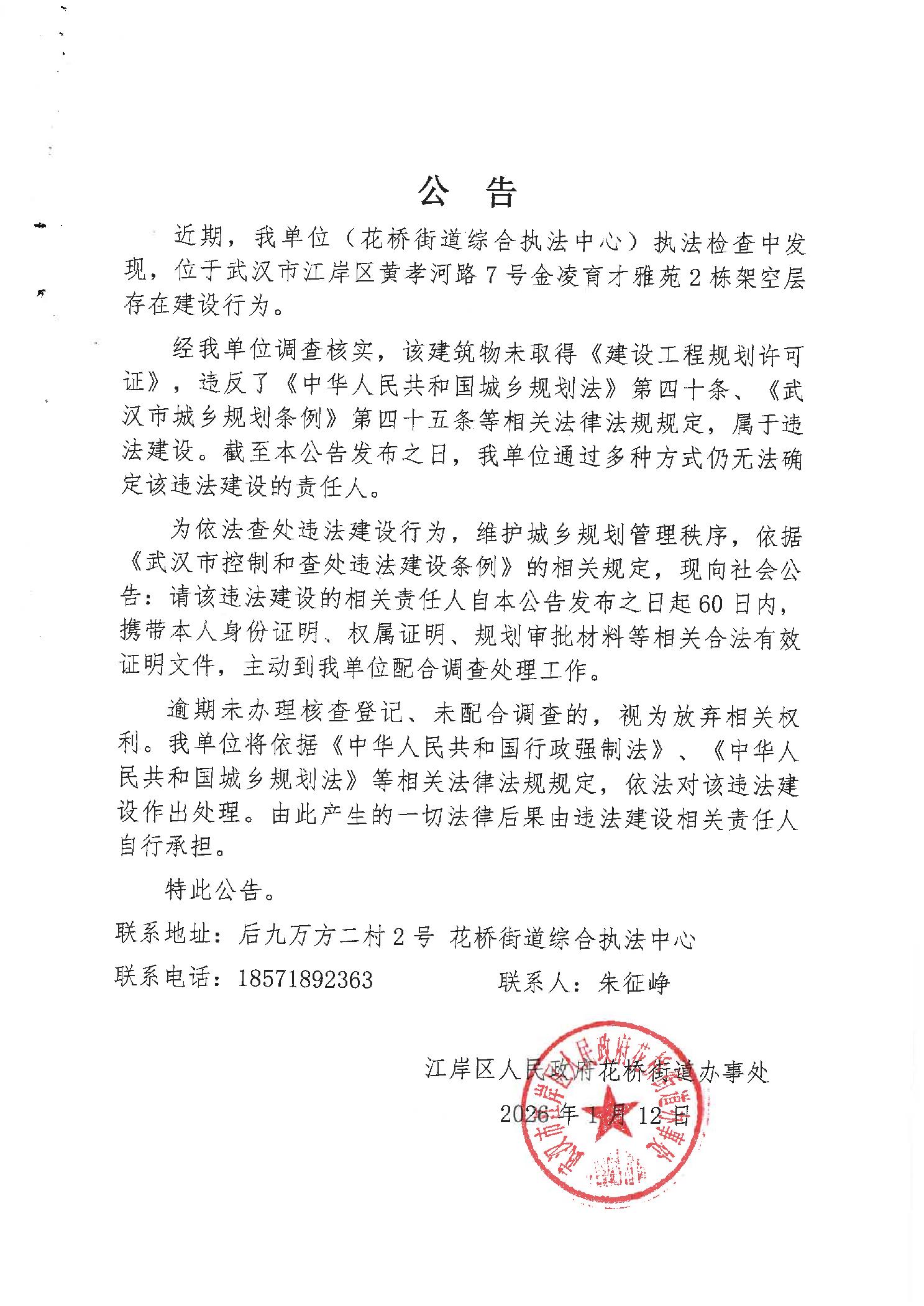 关于黄孝河路7号金凌育才雅苑2栋架空层无主违法建筑的公示