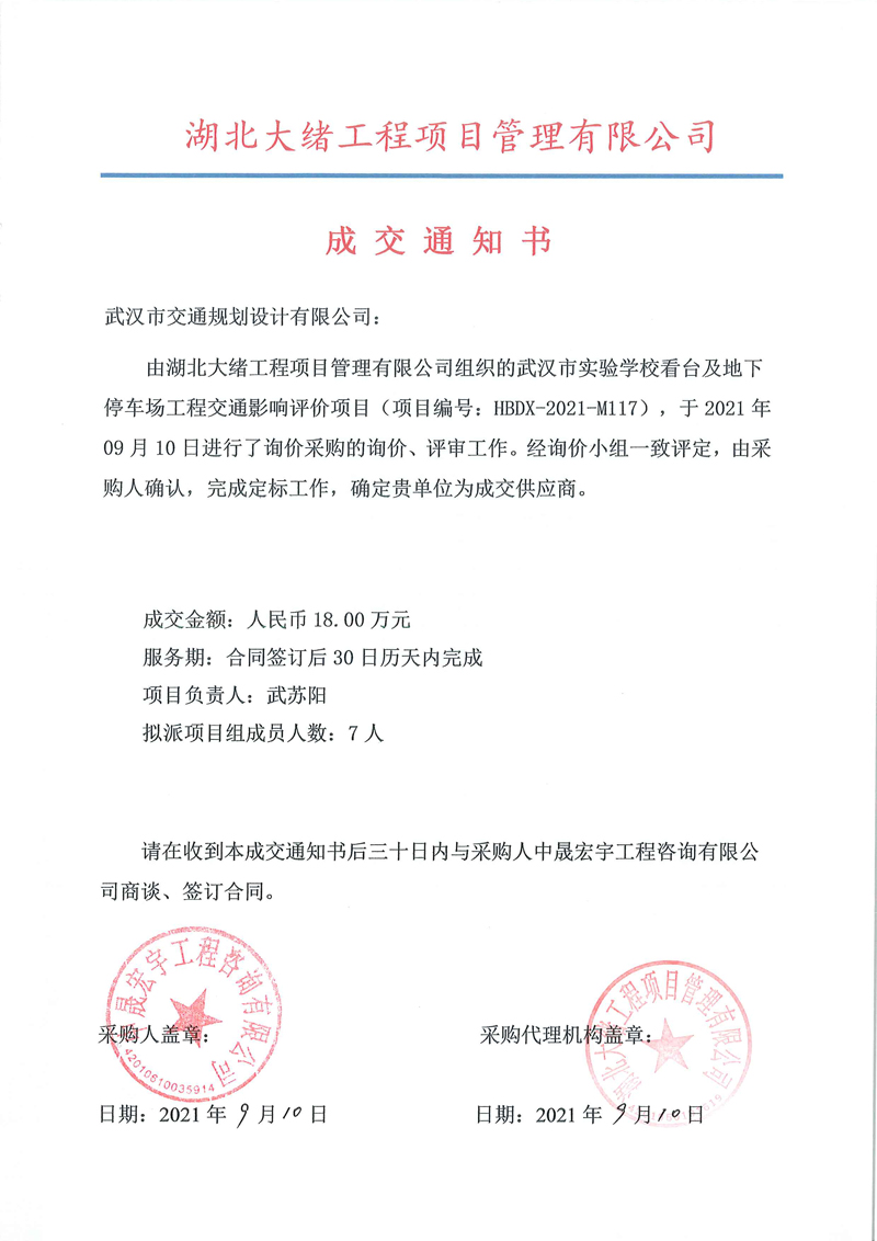 武汉市实验学校看台及地下停车场交通影响评价项目中标通知书